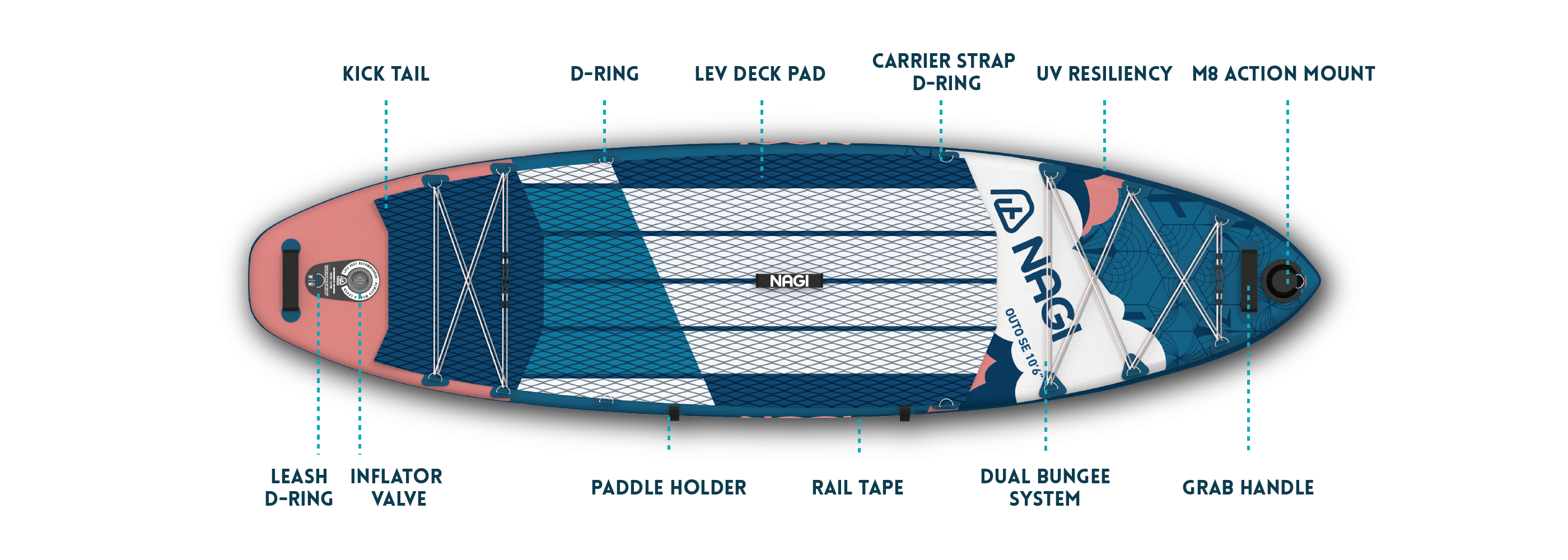 Crafted with military-grade PVC and a composite drop stitch core, the OUTO is durable, stable, yet lightweight, making it the perfect paddle board for paddlers of all levels. Reinforced rail tape provides an extra layer of protection, ensuring that the board remains high performing for years to come.